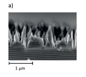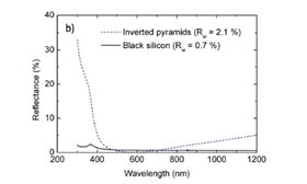 黑硅表面有納米級(jí)小山峰,反射率很低。通過優(yōu)化反應(yīng)離子刻蝕(RIE)工藝的參數(shù)來制作黑硅,由于其在很寬的波段范圍內(nèi)反射率都很低且接受角廣而備受關(guān)注。除了RIE還有其他制作黑硅的方法,如激光制絨、金屬催化濕化學(xué)刻蝕、等離子體浸沒離子注入等。黑硅在太陽能電池應(yīng)用中的一個(gè)難題是黑硅表面面積增大而導(dǎo)致表面復(fù)合速率增大,進(jìn)而造成短波段的光譜響應(yīng)變差。黑硅已經(jīng)被廣泛應(yīng)用到P型電池上,通過熱氧化和沉積SiNx作為正面鈍化層。但是低反射率的增益無法彌補(bǔ)高表面復(fù)合速率的影響,電池效率較低,效率最高可達(dá)到18.2%。