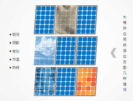 第一,避免了集中型逆變器電站的木桶效應(yīng)(如下圖)。集中式并網(wǎng)逆變系統(tǒng)中,組件方陣經(jīng)過兩次匯流到達逆變器,逆變器最大功率跟蹤功能(MPPT)不能監(jiān)控到每一路組件的運行情況,因此不可能使每一路組件都處于最佳工作點,當有一塊組件發(fā)生故障或者被陰影遮擋,會影響整個系統(tǒng)的發(fā)電效率。所以當電池組件受到遮擋時,集中型電站會受到較大的影響,組串型電站只有被遮擋的一串對應(yīng)的一路MPPT受到影響。而正常情況下,各個組件之間的安裝間距,安裝角度各異,一天中一定時間內(nèi)不可避免會產(chǎn)生局部遮擋,特別是早晚時刻太陽高度角較低的時候,或者出現(xiàn)一些植被遮擋一些電池片。若一個500KW方陣的電池板使用一路MPPT來跟蹤,會損失一定的發(fā)電量。該情況同樣適用于當電池組件發(fā)生臟污、陰影、老化、升溫、熱斑的情況下。
